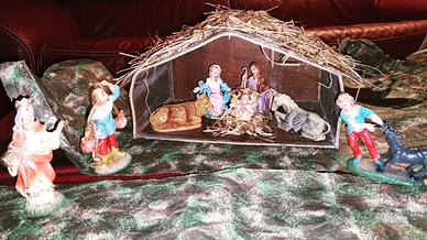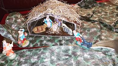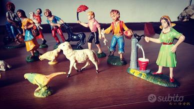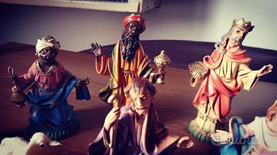 32 statuine made in Italy di presepe di fine anni 80 primi 90 rimaste in perfetto stato. Includono vari personaggi oltre Gesù , Giuseppe , Maria , i Re Magi , anche vari animaletti quali pecore , galline , oche ed altri volatili ed anche il bue e l'asinello.L'altezza varia da un paio di centimetri per gli animaletti più piccoli a 10 centimetri per i personaggi più alti. I personaggi sono in gomma dura super resistente alcuni e in plastica altri. Una delle due Madonne (ce ne sono due), quella che prega, è durissima, forse resina, non saprei. Questa Madonna ha ancora la sua busta originale. Ogni personaggio ha fattezze e pose splendide e colori tenui superlativi rimasti invariati dall’epoca. Gli animaletti più piccoli, ad esempio i volatili, sono un pò più approssimativi ma fanno pur sempre la loro egregia figura. Sono inclusi anche 3 sacchetti (600 grammi totali) di roba vegetale sempre dell'epoca per fare l'ambiente : - uno con piccole ramaglie secche (tipo quelle cose tipo rimasugli di rametti secchi che gli abeti o alberi simili rilasciano al suolo) - uno con muschio artificiale tritato oppure è trinciato di foglioline d'erba tritate finissime quasi a polvere (non so se vere o finte ma il colore così verde intenso è artificiale di sicuro) ed alcuni (pochi) sassolini bianchi, tipo ghiaia credo, ma molto più piccoli e più puliti - uno con trucioli di legna ed altre ramaglie varie (non so come definirle) ed anche quì sono presenti alcuni di quei sassolini Includo anche un quarto sacchetto con fogli-ambiente di carta da mettere come base per fare il suolo. Alcuni di sti fogli sono molto stropicciati e presentano strappi e rimasugli di scotch perchè all’epoca ne usai qualcuno. Includo in omaggio una CAPANNINA sempre dell’epoca ma artigianale fatta da me di 26 x 17 x 15 centimetri. . Guarda sempre la tua cartella SPAM per possibili risposte perse Guarda anche i miei altri annunci TEL. 3716299837