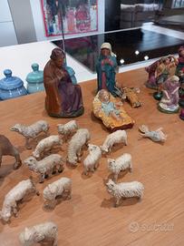 Vendo presepe antico in gesso. Oltre alla Natività, 33 figure, 12 pecore, 1 cammello, 1 bue, un angelo 1 ulteriore Bambin Gesù, per un totale di 52 pezzi. Dai “ricordi” di famiglia, ha almeno 120 anni. E’ in buone condizioni, data l’età! Le figure sono alte dal 10 ai 13 cm. La Natività, pur essendo alta 13 cm. (Maria e Giuseppe), risulta più “imponente”.