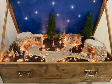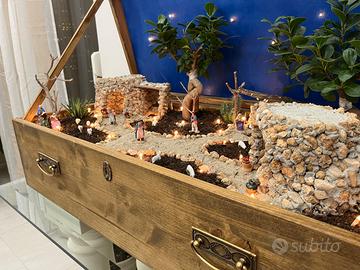 Presepe interamente fatto da un artigiano. In un cassetto antico, con impianto luci incorporato, le piante possono essere cambiate ogni anno a proprio piacimento e infatti ho inserito foto dei diversi anni (si può notare che cambia un po’). Non si vede ma al di sotto c’è anche un frantoio ipogeo con un asinello in movimento. Vendo con tutti i personaggi tranne la natività. Per informazioni ulteriori scrivere.