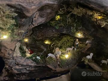 Presepe realizzato artigianalmente, composto da 15 statuine in resina finemente rifinite, ambientato su un tronco d’albero naturale.