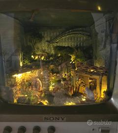 Presepe costruito artigianalmente con pastori in resina e terracotta, in stile napoletano. Creato in un vecchio monitor Sony restaurato. Le misure esterne del monitor sono 22 cm(l) x 23 cm (h) x 24 cm (p). Alimentazione a batteria. Prezzo trattabile.