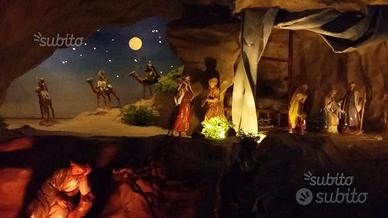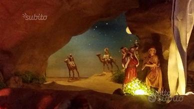 Presepe artigianale stile arabo realizzato in cartapesta con statuine Landi. Il manufatto presenta due livelli sovrapposti, nella parte superiore è stato realizzato un paesaggio con abitazioni tradizionali del tempo e statuine da cm. 3,5. Nella parte inferiore sono state inserite statuine da cm.6,5 in un paesaggio roccioso nel quale si apre la grotta della nativita' e sul fondo uno scorcio con cielo stellato illuminato con fibbre ottiche. Eventuali spese di spedizione a carico dell'acquirente.