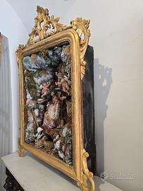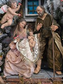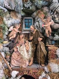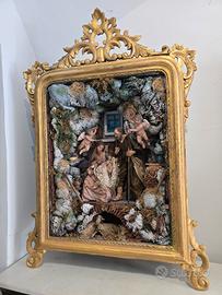Splendido presepe artigianale realizzato secondo la tradizione del Presepe Napoletano, ricco di scena e di dettagli. La composizione rappresenta una Natività in un’atmosfera calda e autentica racchiusa da una fantastica cornice in legno dorata d'epoca. Le figure sono in terracotta dipinta a mano con occhi in cristallo, elemento che dona grande espressività ai volti. Gli abiti sono realizzati in tessuti veri, curati nei minimi particolari. Pastori da 38cm all'incirca. Condizioni buone come da foto. La spedizione sarà accurata e ben organizzata in maniera tale da favorire l'integrità del presepe durante tutto il suo processo di consegna.