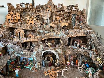 Presepe artigianale originale con manifattura di san gregorio armeno, comprensivo di statuette e ambientazioni, grandezza 1 mt per 1,5 mt su 3 livelli in buono stato