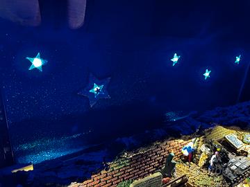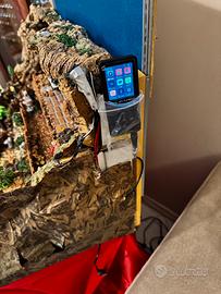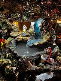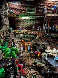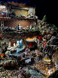 Presepe napoletano completamente artigianale, pezzo unico, stile piazza aperta, cielo rientrante, in legno e sughero. Contiene un sensore di movimento con tempo regolabile a monte e che al passaggio di persone avvia tutte le funzioni: luci, musica, pompa dell’acqua, luci forno. La fontana è in pietra e nei pressi c’è un regolatore del flusso, il forno a led, i pastori in gesso da 3,5 cm circa. Misure larghezza 60 cm circa, altezza a cielo rientrato 40cm, a cielo estratto 52cm, profondità 45 cm circa. Opera artigianale firmata