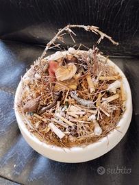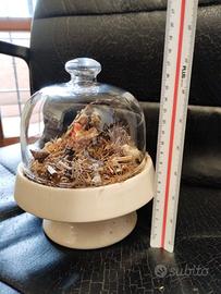 Presepe artistico artigianale realizzato su un'alzata in cermanica con campana di vetro. Contiene sacra famiglia e animali.