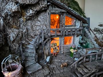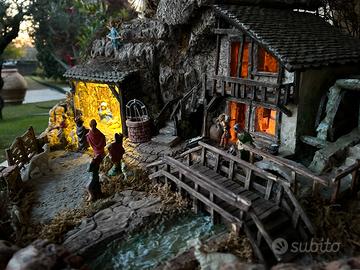 Meraviglioso presepe o presepio artistico costruito da artista trevigiano. Lavorato nei minimi dettagli con altissima cura per i particolari. La scena è incorniciata da mura antiche con la presenza di un cancelletto per accedere al cortile. In esso troviamo a sinistra la grotta della Sacra Famiglia con il tre Re Magi e l’angelo sovrastante la capanna, adiacente la casa del mugnaio con il pozzo, una bellissima scala per accedere al piano superiore e lateralmente un mulino mosso da un fiumiciattolo d’acqua, più in giù un bellissimo ponticello che lo attraversa. Nell’aia troviamo i pastorelli con le pecore e i cani. Sembra uscito da una fiaba. Misure 66 × 64 cm. Prezzo trattabile.