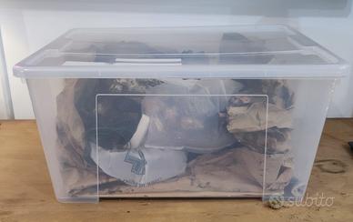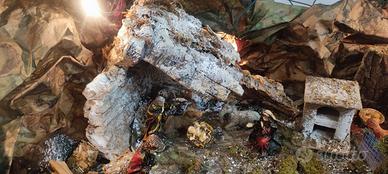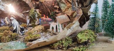 Splendido presepe, capanna interamente fatta a mano con sughero, 12 elementi più case, scenario, rotolo cielo stellato/sfondo Betlemme ancora imballato, alberi, pozzo, aia, muschio vero, sughero, illuminazione e scatola Ikea Samla con coperchio per riporlo, che lo contiene interamente senza doverlo smontare.