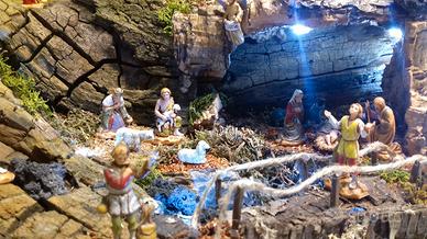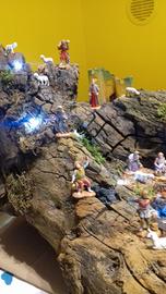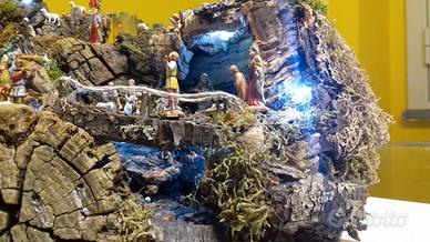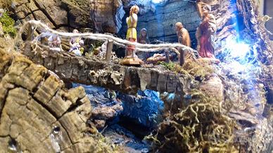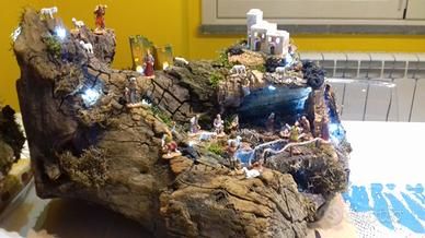 Presepe unico su spezzone di tronco albero con pastori da 2,5 cm e luci LED a batterie come da foto.