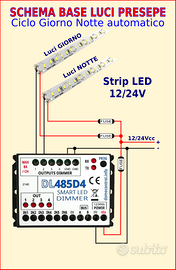 Con DL485D4 potrai programmare i tempi e le dissolvenze / transizioni tra le varie fasi della luce Giorno / Notte / Luci CASE del Mattino / Luci CASE della Sera del tuo PRESEPE