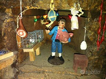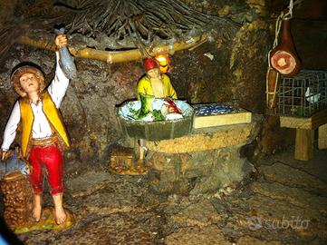 Presepe artigianale 130 x 50 completo di pastori, luci 2 linee, cascata funzionante, 4 interuttori (luci esterne, luci interne grotte, fuochi simulati - forno panificio-cucina osteria-fuoco da campo-braciere, cascata) piu' 1 generale, 3 livelli