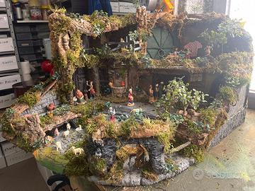 Presepe completo con tutti i personaggi della natività e fontana con pozzo e luci funzionanti