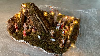 Vendo piccolo presepio fatto completamente a mano con materiali di recupero (muschio, cortecce, pigne, ecc…). Completo di lampadine led. Personaggi esclusi. Misure 40x25 circa.