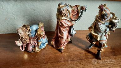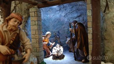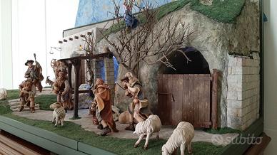 Presepe fatto a mano con materiali vari, impianti di illuminazione a led nascosti con alimentatore 220V ac - 3V dc incluso. N° 24 statuine di legno senza basamento cm 16 della Insam Krippe della Val Gardena, scolpite a mano e dipinte a mano da artista di San Candido, alcune con foglia d'oro. Dimensioni cm 110x52 altezza 47. Peso circa 10 kg