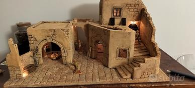 presepe artigianale in polistirene completo di natività e qualche statua e oggetti di arredo (pentole, piatti, secchio, bicchiere, cassetta della frutta) tutto fatto a mano, stuccato e pitturato con colori acrilico, dotato di lampadine e trasformatore con ciabatta. misure 81 per 60, altezza 39.