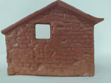 Presepe vintage in ceramica rosa antico anni 50 made in Italy ,capanna mangiatoia con pareti a mattoni ,stella cometa con bue e asinello Maria ,Giuseppe e Gesù . ottime condizioni estetiche .Misura 20X14x14 cm