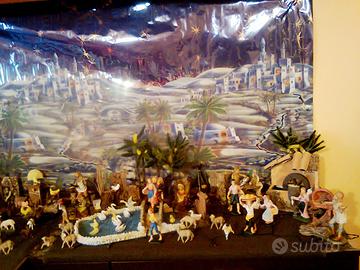 Bellissimo presepe. Ricco di personaggi e arredi, palme, laghetto,mulino funzionante,animali, falò,luci,carta che riproduce il paesaggio. Per dare un'idea della grandezza il presepe occupava un mobile di 180 cm