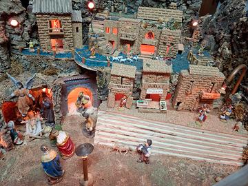 Borgo presepe illuminato con dimensioni di 78X50X70 cm creato con l'utilizzo del sughero per le montagne, il legno per le abitazioni e il muschio per rendere l'idea della vegetazione.