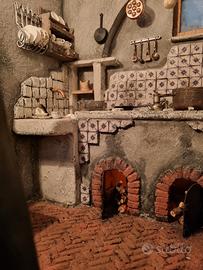 Presepe Napoletano per pastori da 30cm, misure L172/ P70/ H96 (suddiviso in 2 parti). Bifacciale, interamente realizzato a mano, interni locanda e case arredati e rifiniti nei minimi particolari, cascata inserita all'interno della grotta. Corredato di accessori di ogni tipo.