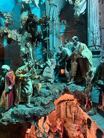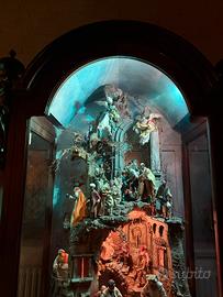 Straordinario presepe napoletano artigianale, custodito in una maestosa teca d'epoca in legno massello lucidato a mano, con vetri su tre lati e finiture intagliate di pregio.