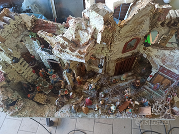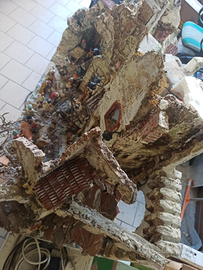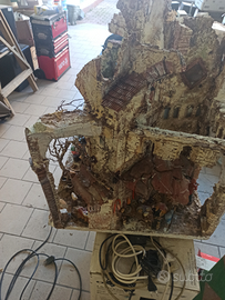 Presepe artigianale completo di pastori pozzetto per cascata acqua e vista angolare con due facciate compreso di illuminazione pastori in terracotta e addobbi vari fatti a mano come pure lampadari minuscoli tutto funzionante