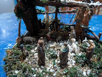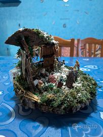 presepe fatto a mano su base di noce con legno e corteccia con decorazioni di luci a led.