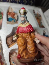 Set di personaggi per presepe in ceramica artigianale, interamente realizzati e dipinti a mano. Le figure sono ricche di dettagli e presentano colori vivaci e ben conservati. Il set comprende i personaggi classici della Natività, tra cui la Sacra Famiglia, i Re Magi, alcuni pastori e gli animali tradizionali, tutti riposti nel loro alloggiamento originale in polistirolo che li ha mantenuti in ottime condizioni, mai usati. Le statuine hanno un aspetto caldo e tradizionale, ideale per chi ama il presepe classico o cerca pezzi artigianali da collezione o da esporre durante il periodo natalizio.