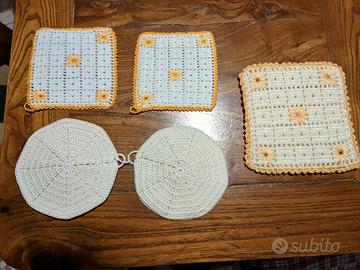 Presine fatte all'uncinetto doppio spessore. Due tonde nocciola diam.12 cm. Due quadrate bianche orlo arancio 12x12 cm. Una quadrata nocciola orlo oro 14x15 cm . La coppia € 5,00 in regalo la singola per acquisto complessivo delle due coppie.