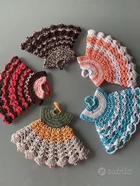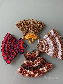 Presine da cucina vestitino, fatte a mano in colori solidi, lavabili in lavatrice. Indicate per piccolo regalo, simpatiche e colorate per una cucina giovane e allegra.
