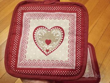 Presine da cucina nuove. Sono 2 in tutto, in cotone robusto, decorate in rosso e bianco. Vendo per inutilizzo. Prezzo trattabile