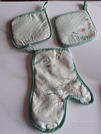 N. 2 presine da cucina e guantone da forno, in delicata stoffa a quadretti con disegni di fiori su uno sfondo delicato verde con colore degradante.