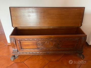 Prestigiosa cassapanca in legno costruita artigianalmente. Di ottima qualità costruttiva, riccamente intagliata e scolpita, con piedini scolpiti a forma di zampe leonine tipica dell’artigianato d’epoca.