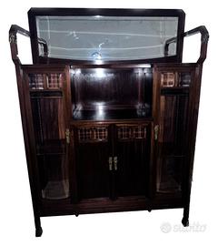 Elegante vetrina buffet in stile Liberty (Art Nouveau) dei primi del '900, caratterizzata da linee geometriche armoniose e dettagli di alta ebanisteria. Realizzata in legno di mogano massello con una splendida venatura a vista, questo pezzo d'arredamento unisce funzionalità espositiva e un design scultoreo unico.