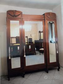 Vendita di pregiati mobili in stile Liberty di transizione (Art Nouveau tardo) risalenti agli anni '20. I pezzi sono caratterizzati da una raffinata combinazione di linee sinuose tipiche del periodo floreale e prime geometrie Art Déco. Realizzati in legno pregiato (noce/ciliegio) con finiture artigianali di alta qualità. Include letto matrimoniale, coppia di comodini con piano in marmo originale, comò con specchiera coordinata e tre sedie, grande armadio con grande vetrata centrale e due laterali, segreter con piano in marmo originale e grande candelabro.
