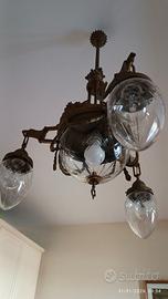 Prestigioso lampadario ferro battuto antico e dorato opaco, risalente agli anni 1920/30, a 4 luci, una centrale e tre ad ampolle intagliate. Altezza/lunghezza cm.100 fino alla parte bassa ampolle laterali, larghezza cm. 50. Come da foto, particolari lavorazioni stile Liberty, bellissimo e perfetto nell'impiantistica, naturalmente rifatta. Data la delicatezza, soprattutto delle parti in vetro intagliato, si opta per il ritiro diretto. Eventuale spedizione da quantificare