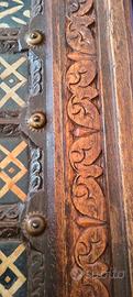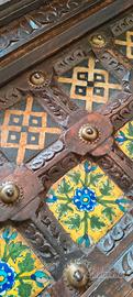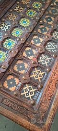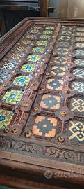 Prestigioso Tavolo Indiano "Haveli" Artigianale - Legno Massiccio, Intarsi e Ceramiche Incredibile tavolino da caffè (coffee table) di grandi dimensioni, autentico esempio di artigianato del Rajasthan. Questo non è un comune mobile etnico, ma un pezzo di alto pregio realizzato partendo da un’antica porta di un palazzo indiano (Haveli). Dettagli che ne certificano il valore: Materiale: Legno massiccio (Sheesham/Teak) con una venatura profonda e calda, lavorato interamente a mano. Lavorazione: Cornice perimetrale riccamente intagliata a motivi floreali. Intarsi e Ceramiche: Il piano presenta una scacchiera di intarsi geometrici in osso/legno chiaro alternati a rare formelle in ceramica dipinte a mano con pigmenti naturali. Finiture in Ottone: Borchie originali d'epoca sapientemente incastonate lungo tutta la struttura. Piano Protettivo: Dotato di piano in plexiglas per proteggere la delicata superficie intarsiata senza nasconderne i dettagli (facilmente sostituibile con vetro temperato per un effetto ancora più lussuoso). Dimensioni importanti: Lunghezza: 135 cm Larghezza: 70 cm Altezza: 44 cm Condizioni: Ottime. Il legno presenta la magnifica patina del tempo che ne attesta l'autenticità. Valutazione: Oggetti di questa caratura e dimensione sono presenti in gallerie specializzate a prezzi superiori ai 1.500€. Vendo a 1000€ per rinnovo arredo. Note: Dato il peso considerevole e il pregio dell'oggetto, si predilige il ritiro a mano in zona