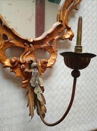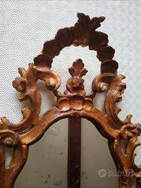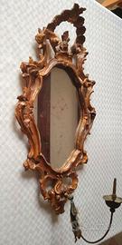 Meravigliosa specchiera “a ventola”rococò veneziana del secolo 1700, in legno scolpito e dorato a foglia oro. La specchiera è perfettamente integra, anche nel suo portacandela in metallo e rame. Lo specchio è antichizzato. Si tratta di un oggetto di alto collezionismo, di particolare raffinatezza nell’esecuzione e nella proporzione. Misure: 84 x 50 x 28 cm In buone condizioni generali, con normali chips o difetti alla laccatura, dovuti ad un oggetto antico e delicato. Lo specchio è antichizzato. E' richiesto il ritiro. Grazie.