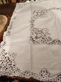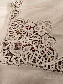 preziosa tovaglietta da thè in lino bianco ricamata a mano con bellissimi ricami su angoli e ricamo centrale. proviene da vecchio corredo. mis 80x80