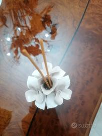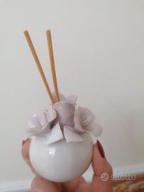 Delicato profumatore con bastoncini in ceramica bianca e fiorellini rosa