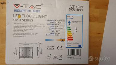 Proiettore, faro LED V-Tac VT-4051 nuovo, Faro LED SMD 50W ultra sottile, colore bianco, SKU 5961, fascio luminoso di 110° e flusso luminoso di 4250 lm. 50W corrispondenti a 250W. Luce bianca calda 3000K. Impermeabilità: IP65. Dimensioni:245x192x28mm. Disponibili: 2 pz. Prezzo/1 pz.: 10,00 euro