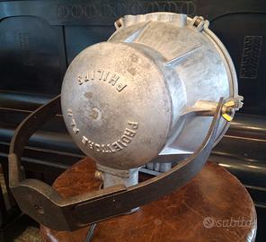 Proiettore Philips, faro industriale d'epoca, in alluminio, ottone e ferro, diametro 34 cm, ricablato e funzionante.