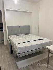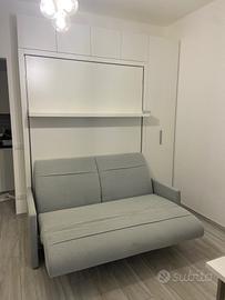 ITO 016 di Clei e' un Sistema trasformabile composto da un letto matrimoniale verticale con apertura abbattibile pronto all'uso, dotato di una innovativa rete a doghe con telaio in alluminio con sistema di regolazione (CF97) e da un comodo divano con seduta scorrevole e reclinabile e poggiapiedi integrato.