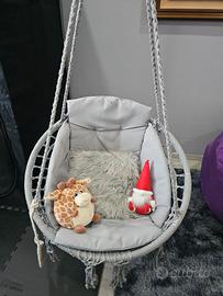 1 altalena da interno: struttura in corda resistente e base in tessuto con cuscino imbottito. Si fissa al soffitto. Perfetta per angoli relax o camera bimbi. Come nuova, usata solo come elemento decorativo.