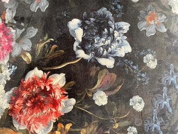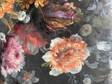 E’ un lungo puff d’epoca imbottito, utilizzabile anche come panca. E’ fatto a mano, e’ robusto, ha molle perfettamente intatte che rendono la seduta comoda e morbida. Il rivestimento originale, ancora presente al di sotto, e’ in canapa color sabbia. L’ho rivestito in velluto con un bel disegno floreale un po’ bohemian che scalda l’ambiente. Non ha macchie, e’ perfettamente pultito.