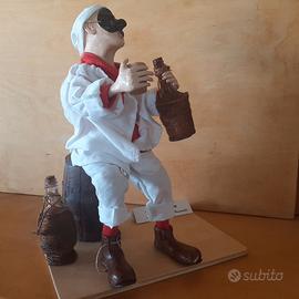 Pulcinella di cm 40 in terracotta, lavorazione artigianale, con vestiti di stoffa e fiaschi impagliati e botte in legno.