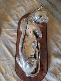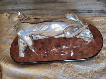 Puma sdraiato sul tronco argentato con base in radica di noce laccata bordata lacca nera - h cm 13 circa lu ghezza cm30 circa