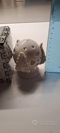 In ceramica, con alloggio per batterie a pillola per accendendo una piccola luce e vederla attraverso i fori del pumo. Batterie non incluse, e ...purtroppo non le avevo a disposizione per far foto con effetto luce accesa.