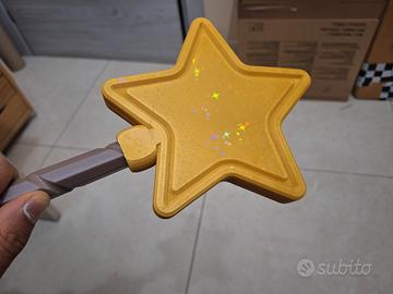 Si può mettere sull'albero grazie al supporto predisposto sul retro della stella oppure con del fil di ferro da inserire dentro la stella che corre lungo tutta la bacchetta.