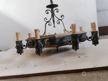 Set comprensivo di 2 lampadari da appendere a soffitto e 8 applique da interno in legno e ferro battuto che sicuramente scalderanno con il loro desing il vostro ambiente, perfette per una casa di villeggiatura o anche di campagna, molto country.