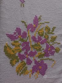 Tovaglia in tela Aida, punto croce, ricamata a mano da me, 6 posti, dettaglio fiore lilla sui quadri bordi della tovagliabe e cornice a fiori per tutta la tovaglia e cornice greca centrale.